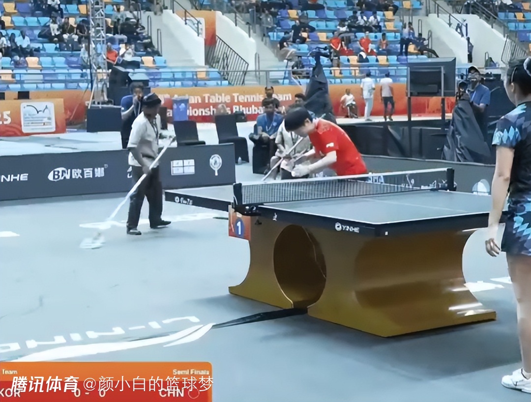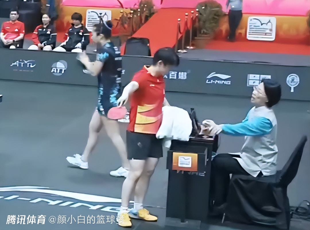 但这场比赛的小插曲很多,比赛刚刚开场孙颖莎就找到裁判说自己球台的那边有水印,随后工作人员进场拖地。