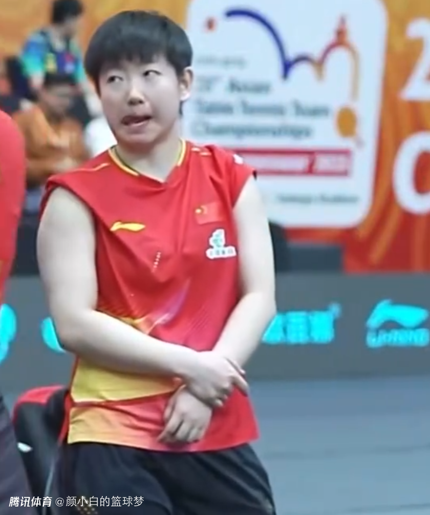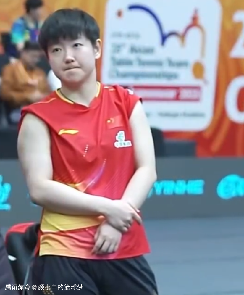 第一盘结束后轮到队友上场了,孙颖莎就在场下嘟嘴、饶舌超级可爱。
