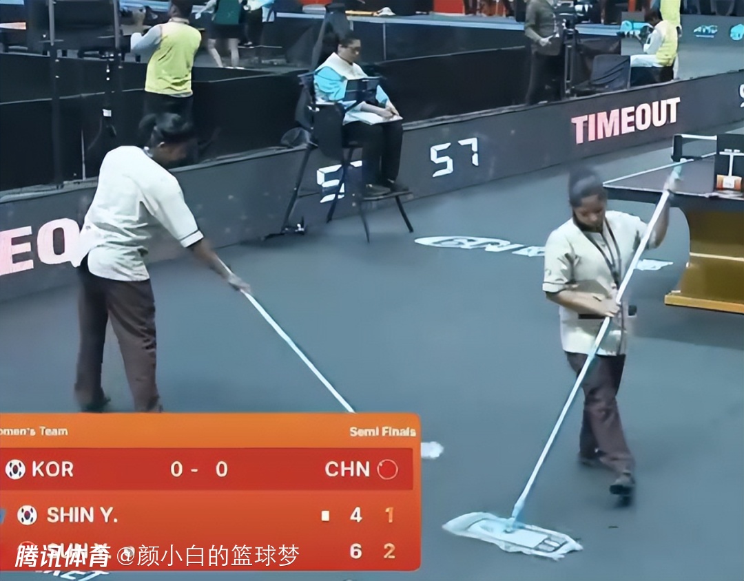 打到6-4擦汗的时候工作人员再一次进场拖地,很明显是球馆有滴水,孙颖莎球台这边有少量的积水,这对于正在比赛的运动员是一个巨大的安全隐患。