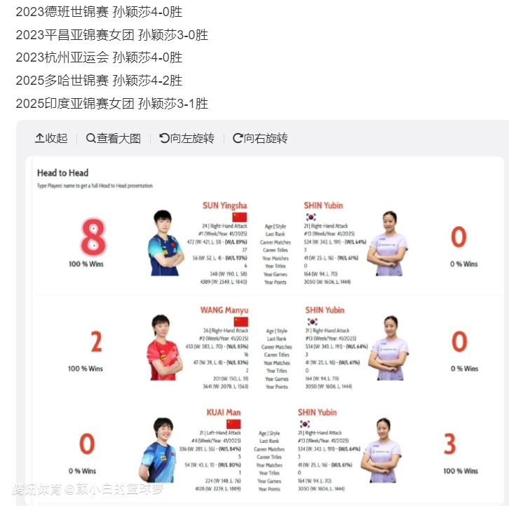 孙颖莎这场比赛击败申裕斌后,已经完成了在世界性大赛(不算商业赛)的5连胜,从2023年德班世乒赛开始孙颖莎就没有输过申裕斌: