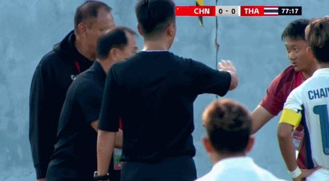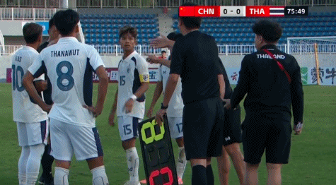 最终,主裁判还是要求泰国队10号球员离场,8号球员替补出场。这场闹剧足足持续了4分钟,比赛才最终恢复进行。