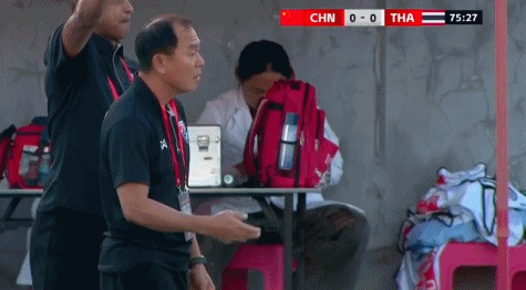 主裁判走过来坚持要求泰国队10号球员退场,这让泰国队主帅非常不满,与主裁判、第四官员发生了争执,甚至指着自己的脑袋示意,“主裁判脑子不好”。