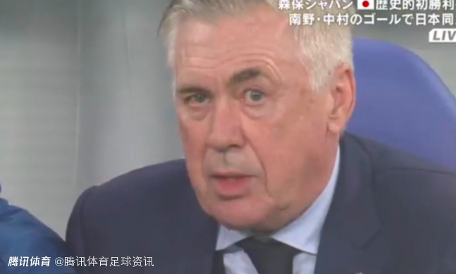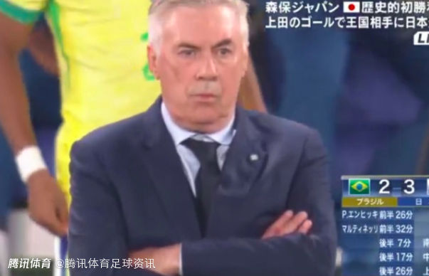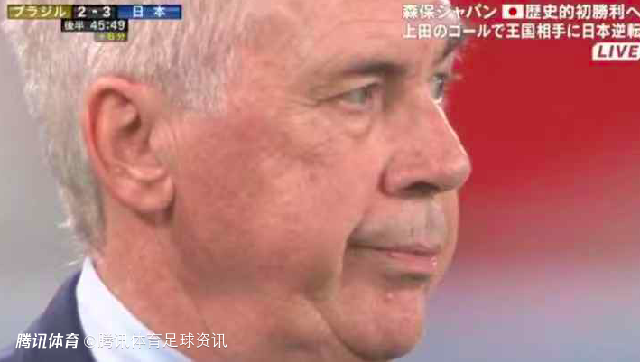巴西一度取得2-0的领先,但是下半场风云突变,被日本连进三球逆转。而镜头也对准了场边的巴西队主帅安切洛蒂,当看到球队20分钟连丢三球,安帅在场边双手抱胸表情严肃。