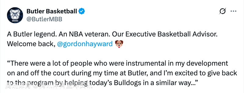 2025-10-14 23:40北京时间10月14日,据巴特勒大学体育部官网报道,已经退役的海沃德回到了母校,将担任巴特勒大学男篮的篮球执行顾问。