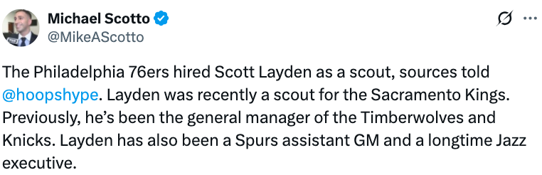 此前曾担任森林狼尼克斯总经理!76人聘请莱登担任球队球探