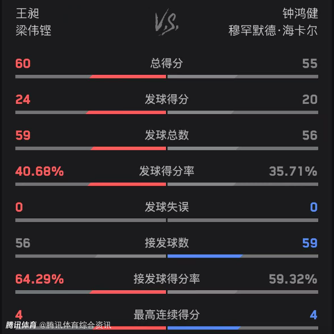 双方技术统计如下(梁王组合在前):总得分60-55、发球得分24-20、发球得分率40.68%-35.71%。