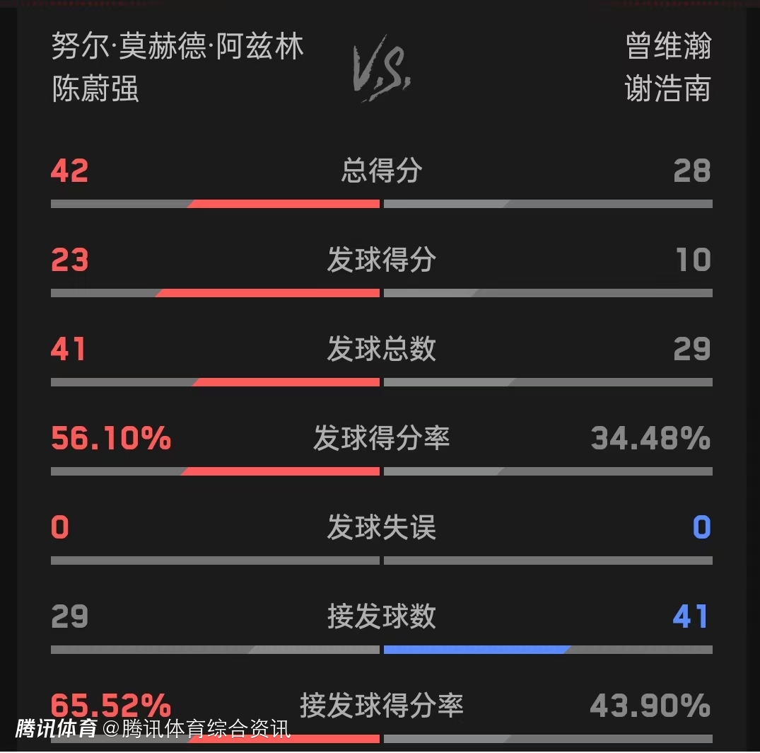 双方技术统计如下(曾维瀚/谢浩南在后):总得分42-28、发球得分23-10、发球得分率56.10%-34.48%。