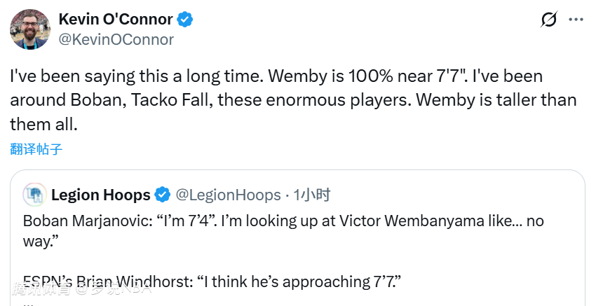 名记文霍斯特随后表示:“我认为文班亚马已经接近2米31(7英尺7英寸)。”此后,名记奥康纳转发表示:“我早就说过这话!文班亚马绝对接近2米31,我亲眼见过博班、法尔这些巨人中锋,但文班站在他们面前时,他比所有人都高出一截!”