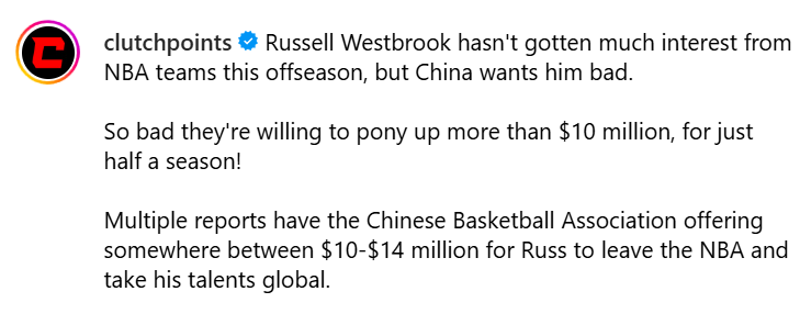 多篇报道显示,中国男子篮球职业联赛(CBA)为威斯布鲁克提供了1000万至1400万美元的合同,希望他离开NBA,前往海外展现球技。
