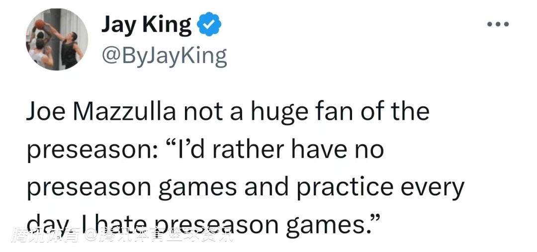 近几周,凯尔特人队一直在忙于季前赛,但马祖拉本人却对季前赛毫无兴趣。他在接受采访时表示:“我宁愿没有季前赛,每天只训练。我讨厌季前赛。”