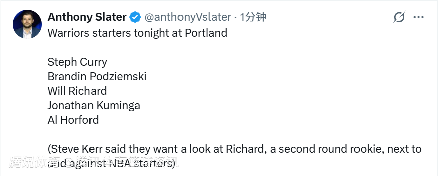 次轮秀理查德进入首发!勇士变阵对战开拓者 库里领衔库明加霍福德在列