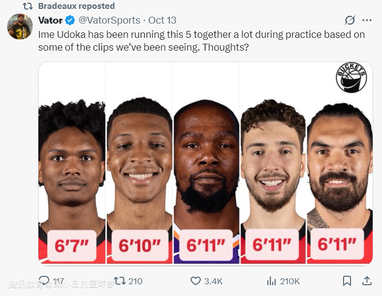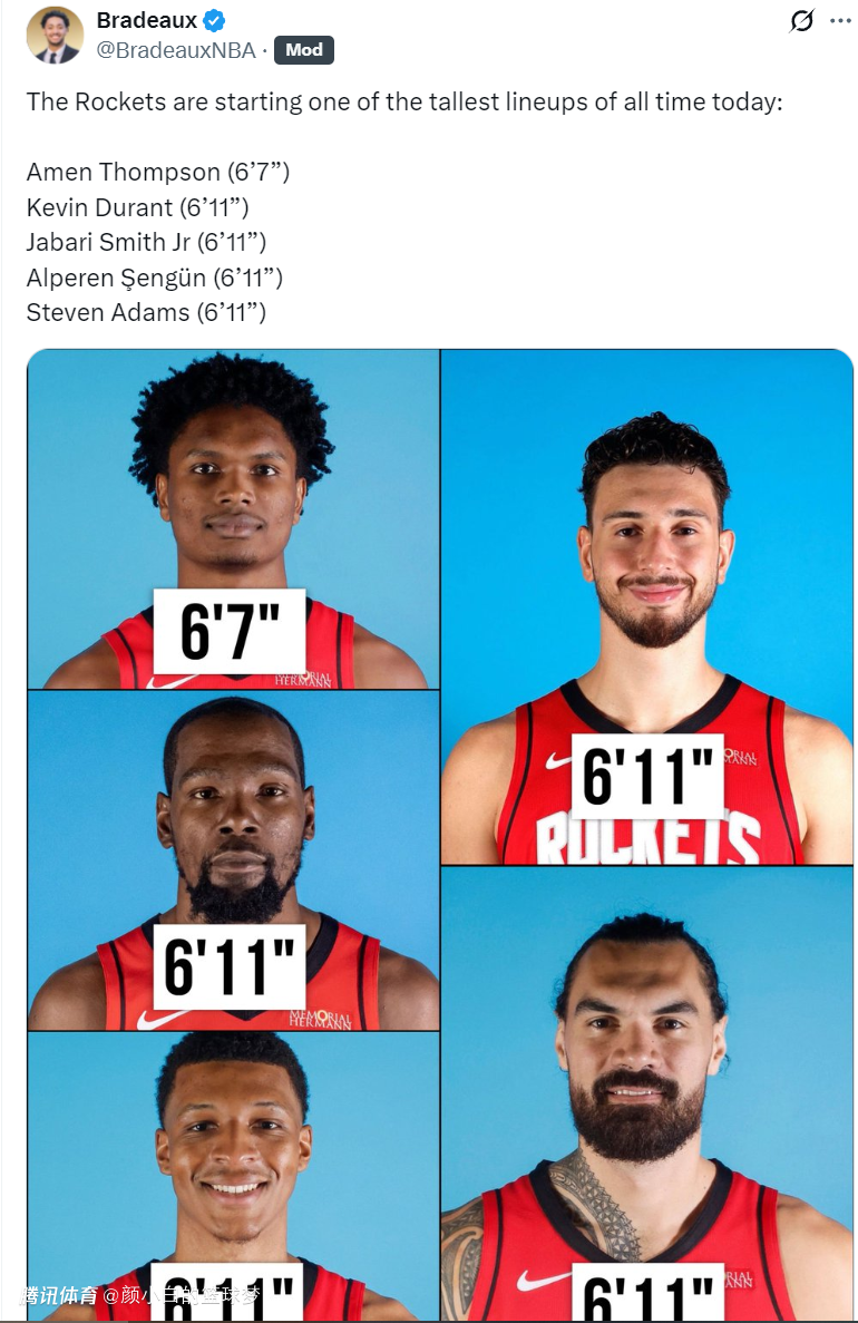 这套先发阵容阿门6尺7(2.01米)、小贾巴里6尺10(2.08米)、杜兰特6尺11(2.11米)、申京6尺11(2.11米)、亚当斯6尺11(2.11米),先发平均身高2.084米。