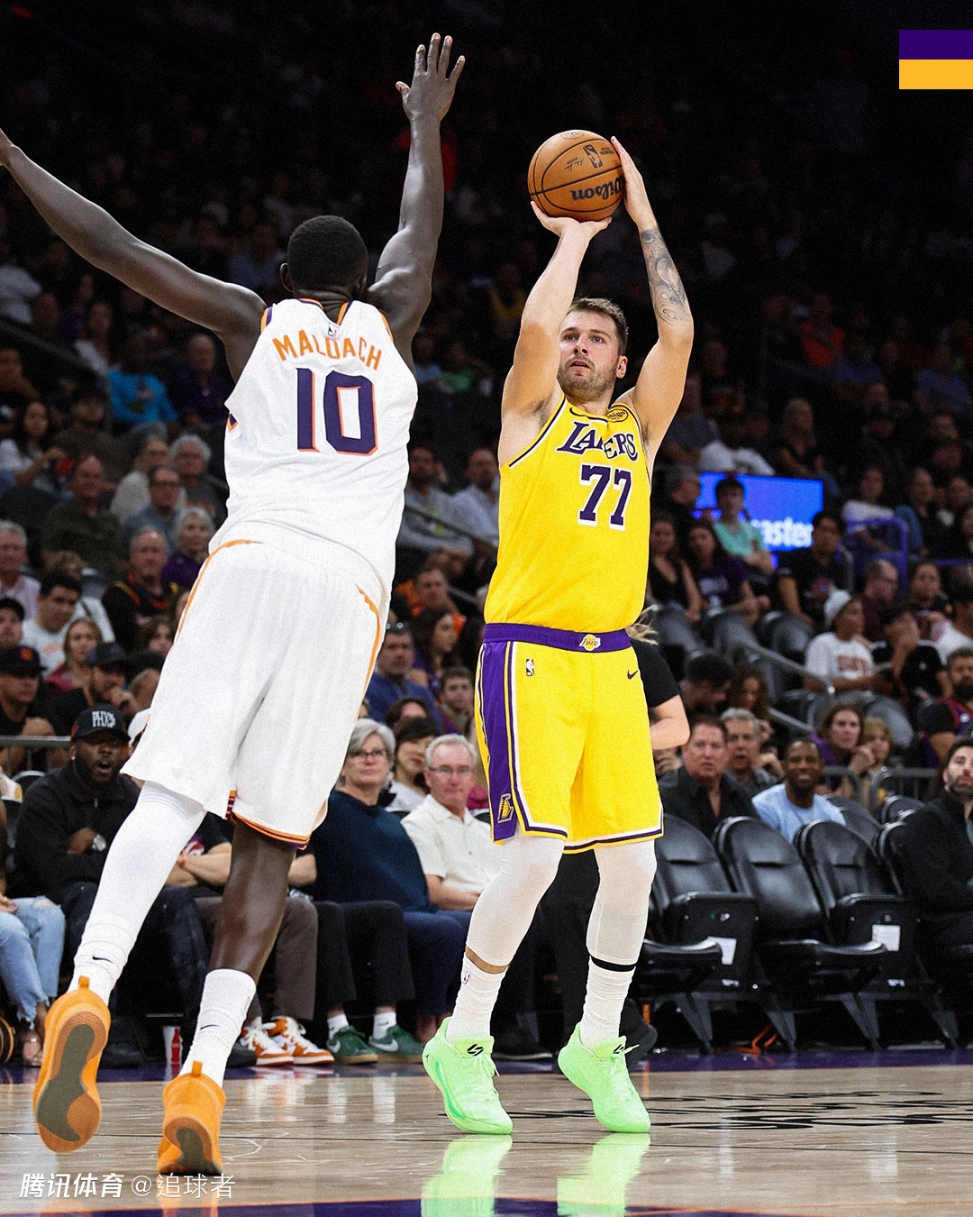 由于今夏带领斯洛文尼亚男篮参加欧锦赛,东契奇连续缺席了三次季前赛,今日湖人客场对阵太阳,詹姆斯因坐骨神经痛继续休战,东契奇正式复出,与里夫斯、斯马特、艾顿和拉拉维亚一起首发出战。