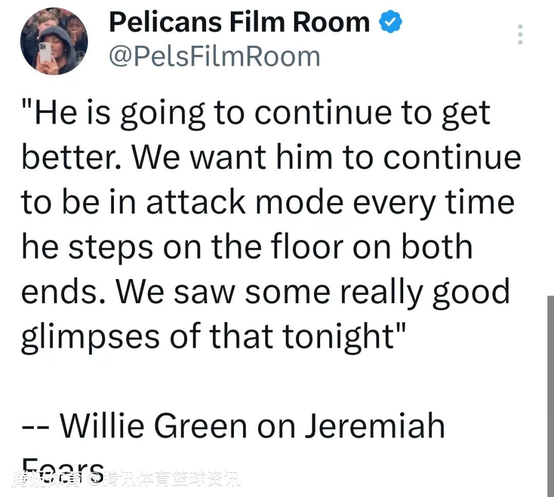 在谈到杰里迈亚-费尔斯的发挥时,威利-格林说道:“他会继续变得更好。我们希望他每次踏上球场,在攻防两端都能始终保持攻击模式。今天我们已经看到了一些非常不错的迹象。”