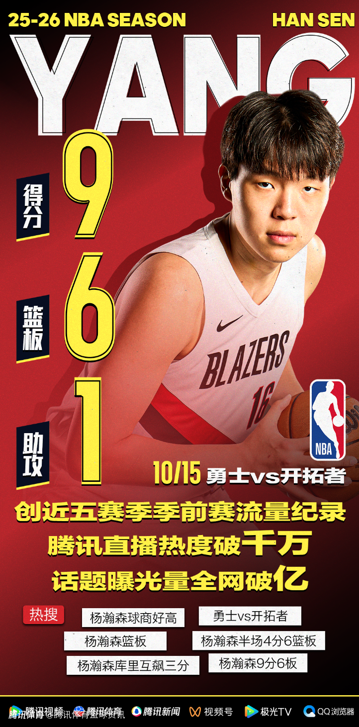 此役杨瀚森替补出战20分钟,11中4,三分球4中1,拿到9分6篮板1助攻1盖帽。