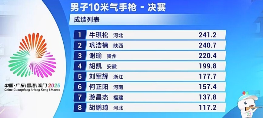 进入奖牌轮次,谢瑜在第22发打出9.3环的成绩,排名掉到了第3位,遗憾获得铜牌。牛琪松和巩浩楠进入到最后2发射击,第23发巩浩楠失误打出9.0环,牛琪松10.6环取得1.3环的优势。牛琪松最后稳扎稳打,以241.2环的成绩摘金,巩浩楠以240.7环的成绩获得银牌。