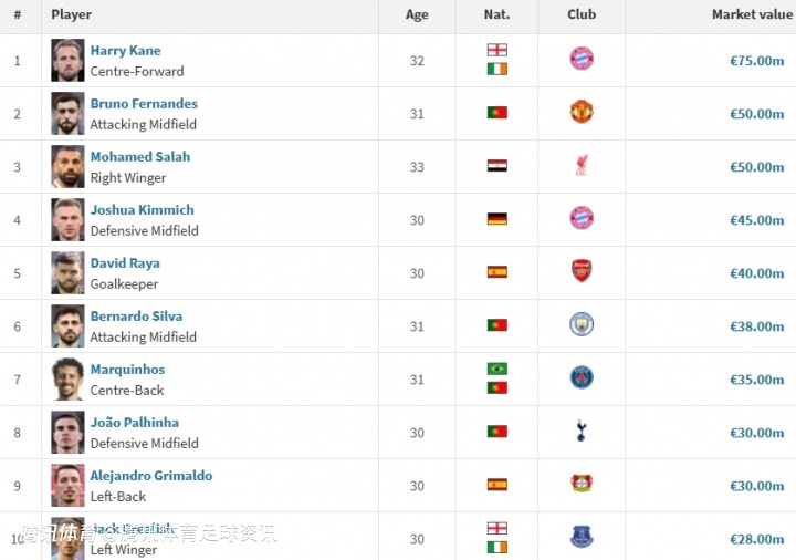 1 凯恩(拜仁) 32岁 —— 7500万欧