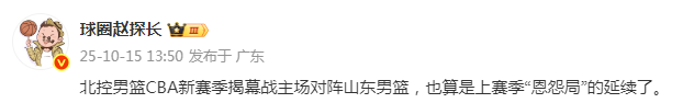 “北控男篮CBA新赛季揭幕战主场对阵山东男篮,也算是上赛季‘恩怨局’的延续了。”该媒体人在社媒上写道。