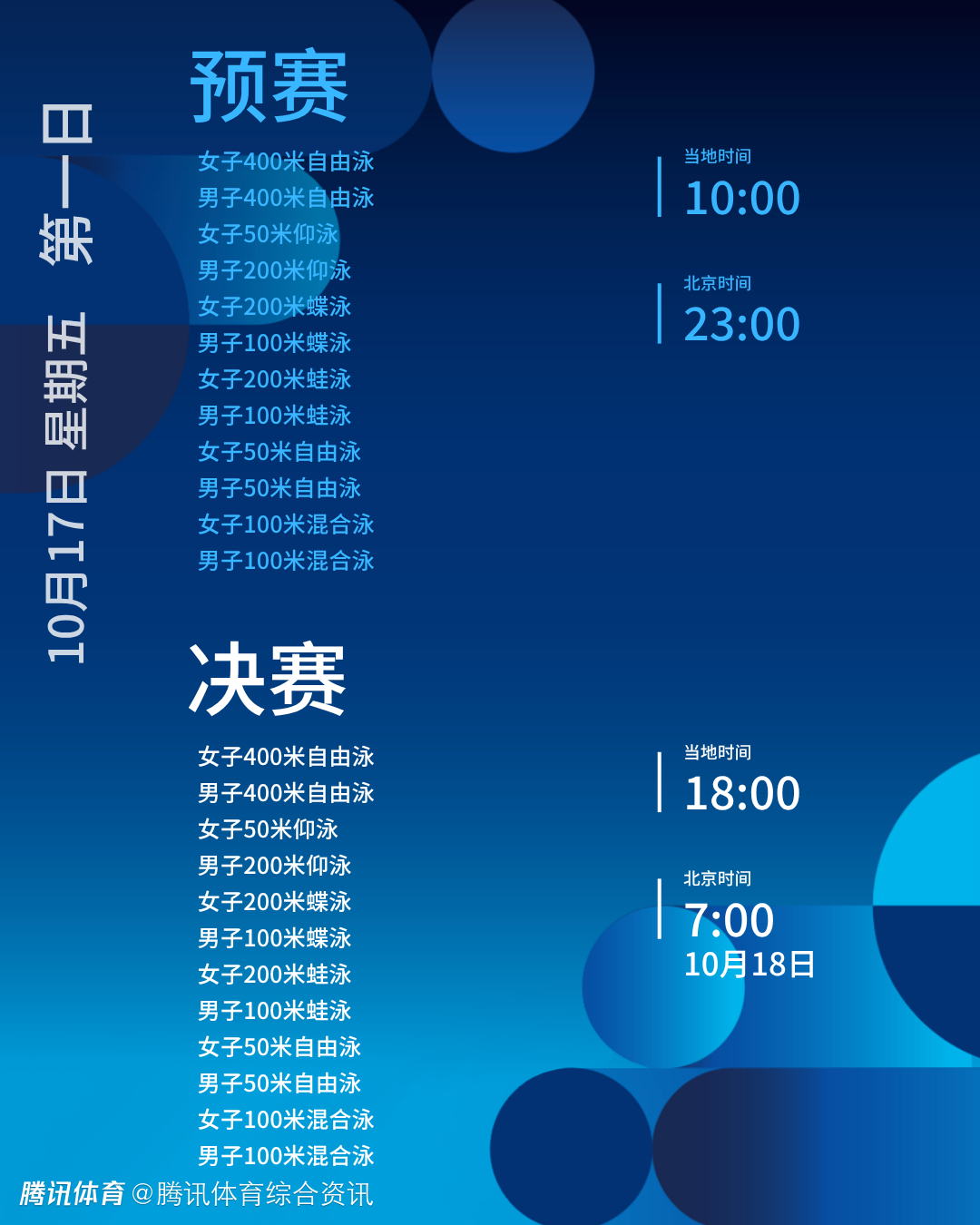 比赛首日将在北京时间10月17日晚间11点进行,届时将有男女400米自由泳、女子50米仰泳、男子200米仰泳、女子200米蝶泳、男子100米蝶泳、女子200米蛙泳、男子100米蛙泳、女子50米自由泳、男子50米自由泳、女子100米混合泳、男子100米混合泳的预赛先行进行。