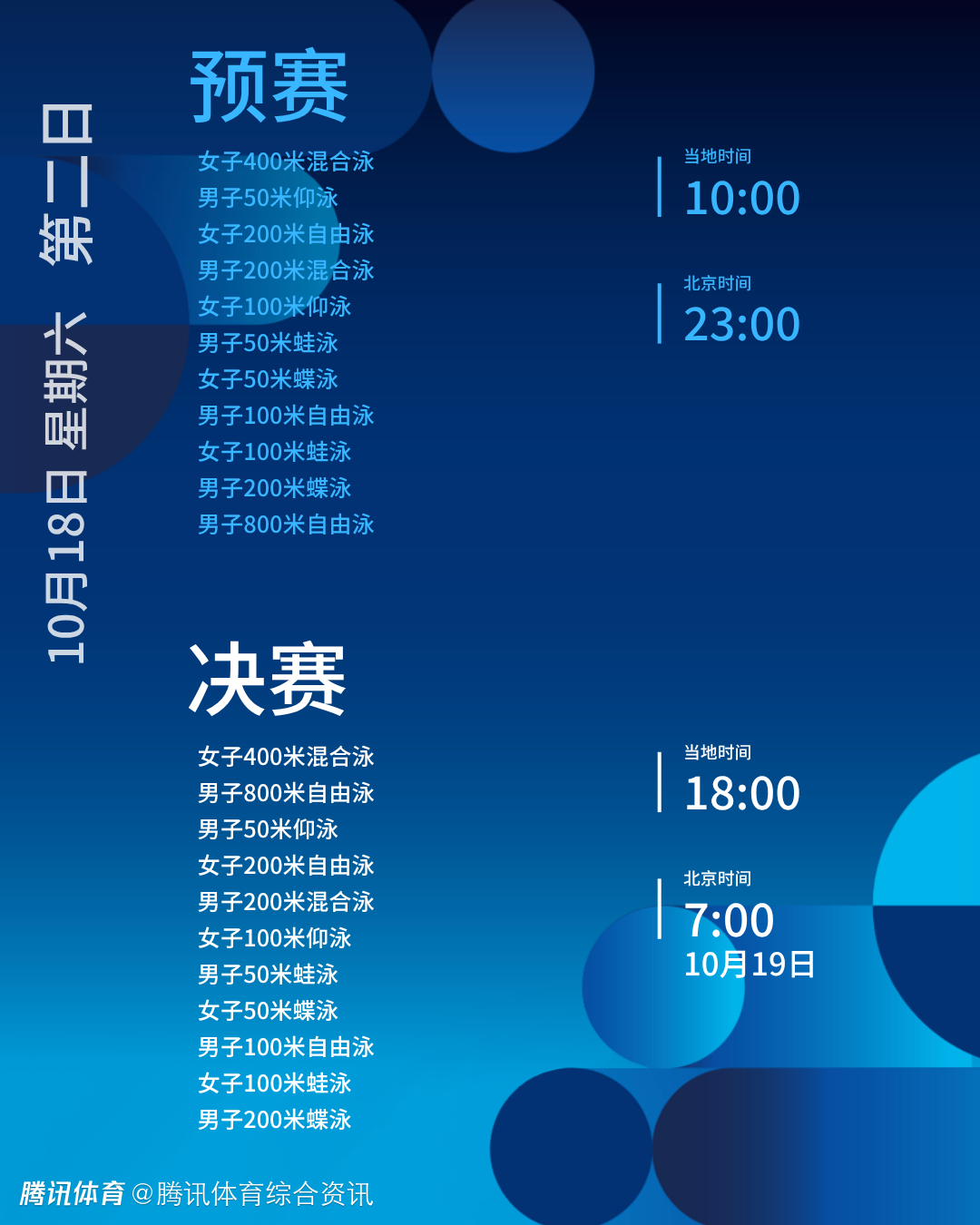 最后一日的决赛将于北京时间10月20日早上7点进行,项目包括男子400米混合泳、女子1500米自由泳、女子100米蝶泳、男子50米蝶泳、女子200米仰泳、男子100米仰泳、女子50米蛙泳、男子200米蛙泳、女子100米自由泳、男子200米自由泳、女子200米混合泳项目的决赛。