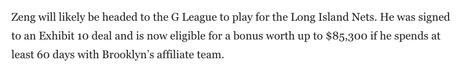 曾凡博预计前往长岛篮网效力 若在G联赛待满60天可获8.53万美元