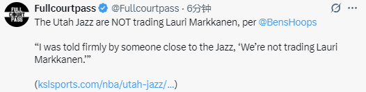 而关于爵士队是否会交易马尔卡宁,该记者也给出了自己的分析,他认为爵士队不会主动兜售马尔卡宁,但会听取其他球队的报价,毕竟在NBA,只要报价足够丰厚,没有哪位球员是“非卖品”。