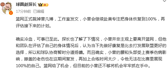 媒体人:曾凡博非主观上要离开篮网 团队评估后认为康复比发展联盟更好