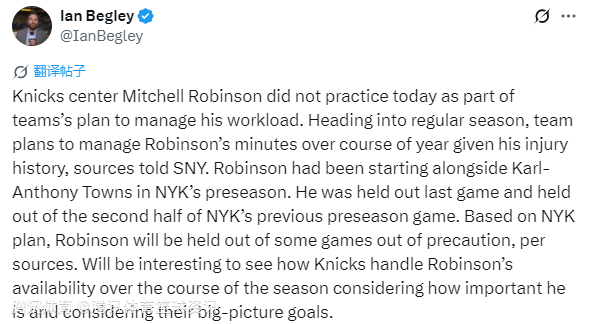 在尼克斯队的季前赛中,米切尔-罗宾逊此前一直与唐斯搭档首发。他缺席了上一场季前赛,且在前一场季前赛的下半场也未登场。消息人士表示,根据尼克斯队的计划,为谨慎起见,米切尔-罗宾逊还将缺席部分比赛。