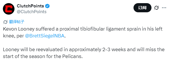 2025-10-16 05:10北京时间10月16日,据记者Brett Siegel报道,鹈鹕新援卢尼遭遇左膝近端胫腓韧带扭伤,将在约2至3周后接受复查,期间他将缺席鹈鹕队的赛季开局阶段比赛。