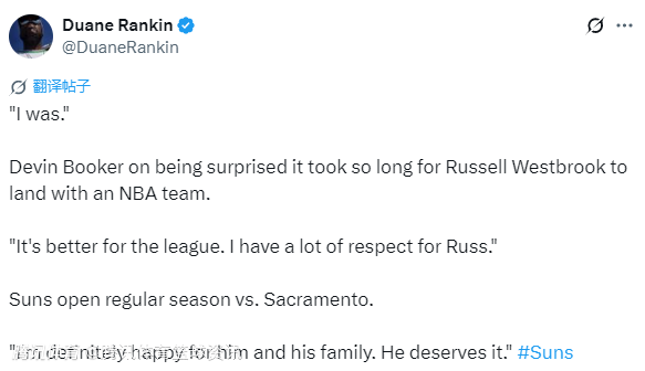 布克说道:“回顾威少的职业生涯,我得说,这样的结果对我来说也挺好的。我非常尊重他,也为他能有这样的成就感到高兴。我们首场比赛的对手就是他所在的球队,想想还挺特别的。我真心为他和他的家人感到开心,他配得上这一切。”