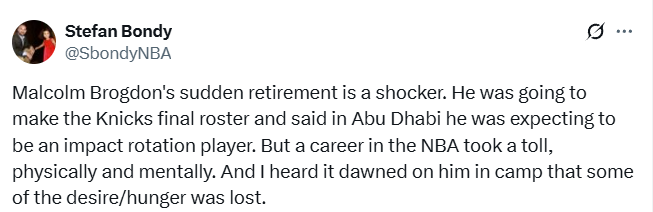 布罗格原本有望进入尼克斯队的新赛季大名单。他的退役声明如下——