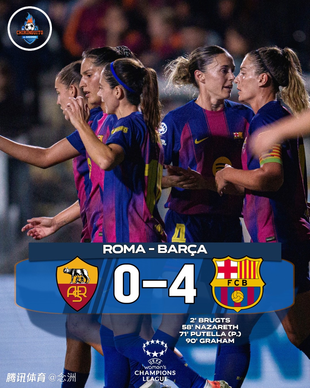 女足欧冠联赛阶段第二轮多场比赛战罢,巴萨女足客场4-0大胜罗马女足,豪取赛季开局9连胜,进48球只丢2球。