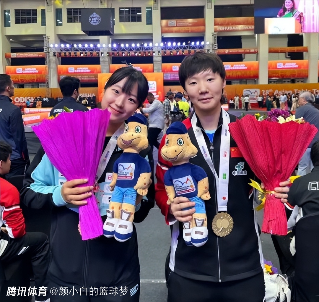 世界第一孙颖莎与申裕斌的合影两人也都露出大笑,孙颖莎已经是国乒女团核心很久,申裕斌首次成为球队的王牌就取得这样的成绩真的已经挺不错。