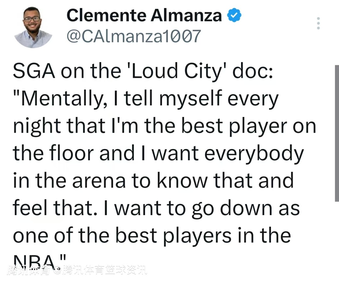 2025-10-16 08:10北京时间10月16日,雷霆球星亚历山大接受媒体采访,谈到新近发布的雷霆夺冠纪录片《喧嚣之城》,直言自己志在成为NBA顶级球员。