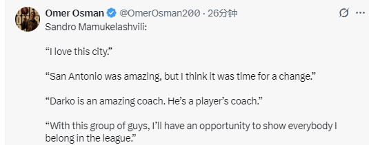 马穆凯拉什维利说道:“我热爱这座城市。我在圣安东尼奥的经历很棒,但我觉得是时候做出改变了。达科是位出色的教练,他是那种为球员着想的教练。和这群队友一起,我会有机会向所有人证明,我属于这个联盟。”