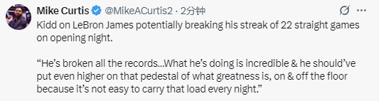 在谈到詹姆斯可能终结连续22场揭幕战出战纪录时,基德说道:“他已经打破了所有纪录……他如今所做的一切令人难以置信。无论在赛场内外,他都理应被置于更高的‘伟大’层级之上,因为每晚都承担这样的重任绝非易事。”