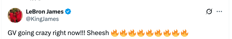 文森特的火热状态,也引起了詹姆斯的注意,后者更新社媒写道:“GV(文森特)要疯了。”
