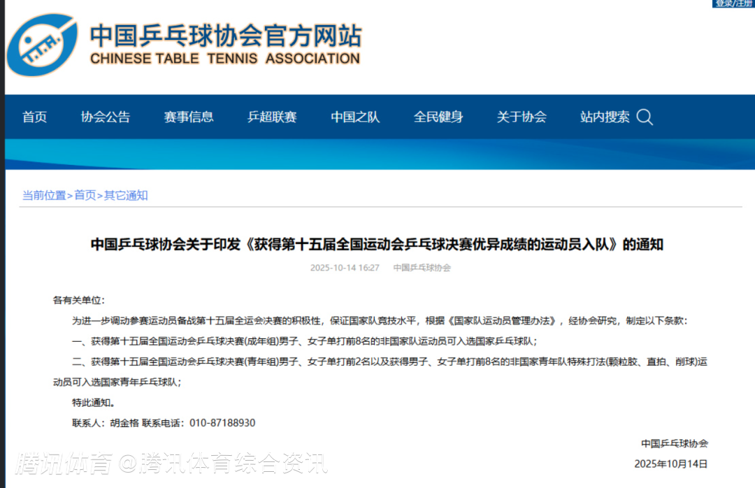 2025-10-16 13:20北京时间10月16日,中国乒乓球协会发布《获得第十五届全国运动会乒乓球决赛优异成绩的运动员入队》的通知。