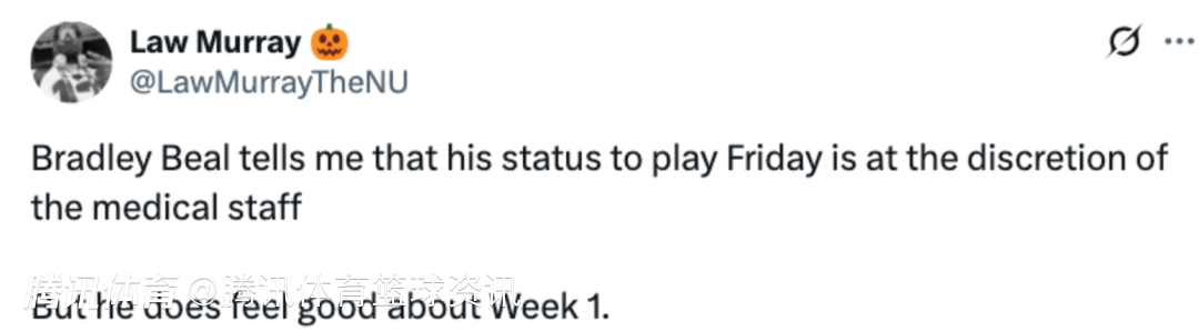 赛后,据快船队记Law Murray报道,比尔告诉自己,他在周六能否出战由医疗团队决定,不过他对第一周的比赛感觉不错。