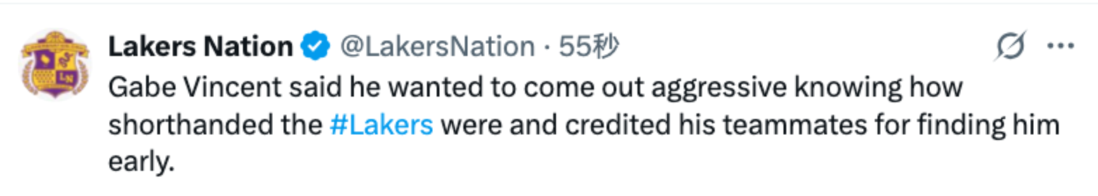 文森特表示,他知道湖人阵容不整,所以想打得有侵略性一些,同时他也称赞队友早早地就为他创造了机会。