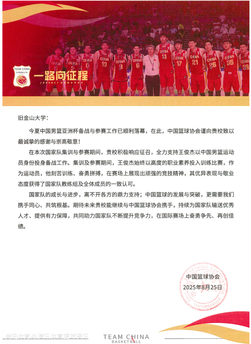 2025-10-16 15:20北京时间10月16日,中国篮协给旧金山大学发去一封感谢信,在信中对该大学培养球员王俊杰方面所付出的努力表达了高度认可与感谢。