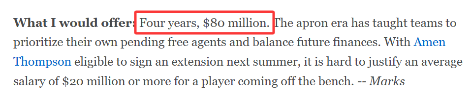 “奢侈税起征线时代”的经验告诉各队:需优先留住本队即将成为自由球员的核心,同时平衡未来财务状况。鉴于阿门-汤普森明年夏天将具备续约资格,为一名替补球员提供“年均2000万美元及以上”的合同,合理性难以支撑。