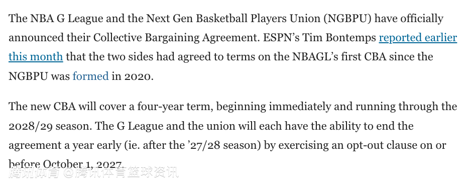 2025-10-16 22:50北京时间10月16日,NBA G联盟与新生代篮球运动员工会(NGBPU)已正式宣布达成集体劳资协议。ESPN 的记者蒂姆-邦滕普斯在本月早些时候报道称,这份协议是自2020年NGBPU成立以来,G联盟与球员工会之间达成的首份劳资协议。