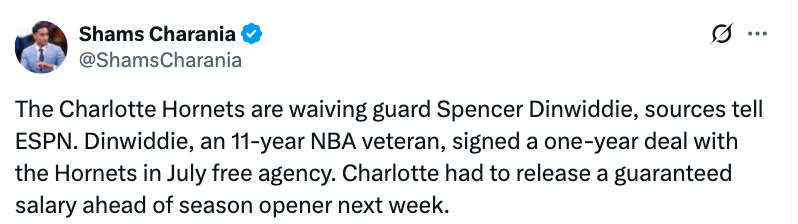 2025-10-17 01:30北京时间10月17日,据名记Shams报道,夏洛特黄蜂队将裁掉后卫丁威迪,他今年7月以自由球员身份与黄蜂签下了一份一年合同。由于新赛季下周即将开打,黄蜂必须裁掉一名持有保障性合同的球员(以符合薪资规则)。