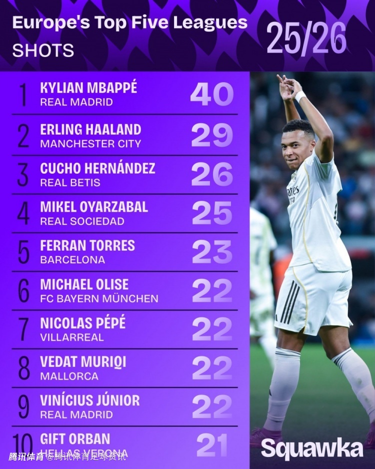 2025-10-17 07:00北京时间10月17日,据数据网站Squawka统计,2025-26赛季欧洲五大联赛多项个人数据榜单出炉。
