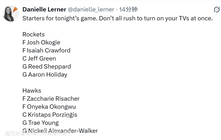 2025-10-17 07:30北京时间10月17日,NBA季前赛继续进行,火箭将对阵老鹰。赛前,两支球队分别公布本队首发阵容安排。