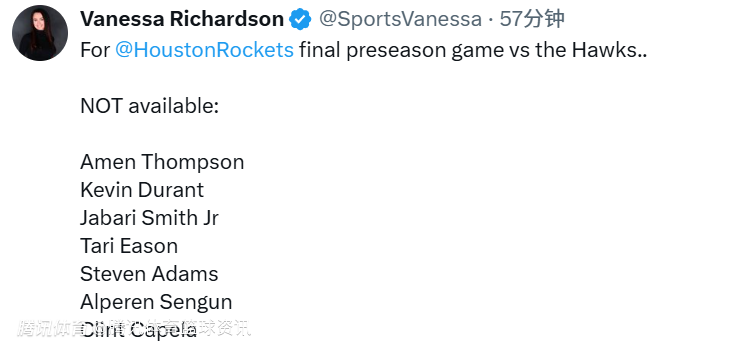 火箭vs老鹰首发阵容出炉:杜兰特领衔7人缺战 雪藏主力备战揭幕战
