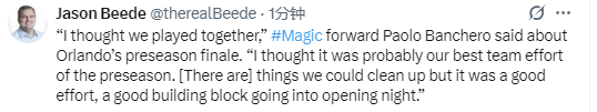 “我认为我们打出了团队协作的表现,”班凯罗在谈及奥兰多魔术队的季前赛收官战时表示,“我觉得这或许是我们整个季前赛阶段团队表现最好的一场。虽然还有一些细节需要改进,但这场比赛打出了不错的水准,也为即将到来的揭幕战打下了良好的基础。”