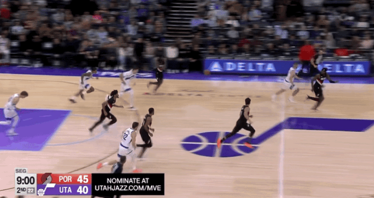 次节比赛开始,格兰特三分命中,阿弗迪亚打进2+1,开拓者打出一波18-4的进攻高潮,成功逆转局势并拉开分差到双位数。乔治、马尔卡宁和菲利波夫斯基连续罚球止损,爵士以一波9-0高潮还以颜色。夏普三分命中,马尔卡宁空切扣篮,乐福连得5分,凯斯勒2罚1中,霍勒迪连得5分。半场比赛结束,开拓者64-60领先爵士。
