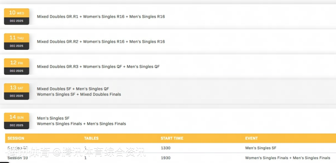 12月13日(周六):混双半决赛、男子单打1/4决赛、女子单打半决赛、混双决赛;